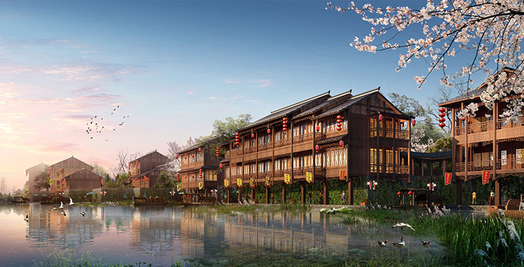 栗河吊腳樓沿河呈狹長(zhǎng)不規(guī)則帶狀,南北向進(jìn)深約25m,東西向?qū)捈s527m。項(xiàng)目占地面積12486.41平米(18.73畝),總建筑面積4520.87平米,分為A至J十個(gè)單體建筑,建筑層數(shù)1~2層,門面商鋪45間,沿河道均勻分布。建筑依據(jù)場(chǎng)地,與南側(cè)道路平行布置,建筑主入口面向場(chǎng)地南側(cè)道路,建筑沿河布局,底部1層為架空空間,其上為主體建筑,建筑整體風(fēng)格風(fēng)貌為仿明清時(shí)代,外觀簡(jiǎn)潔、大方,給人以明朗、周正的空間體驗(yàn)。契合時(shí)代新形象,尺度更為親切。場(chǎng)地內(nèi)部景觀主要由硬質(zhì)景觀與軟質(zhì)景觀共同構(gòu)成。硬質(zhì)景觀主要包括廣場(chǎng)、步道和活動(dòng)場(chǎng)地,軟質(zhì)景觀主要是綠化種植。